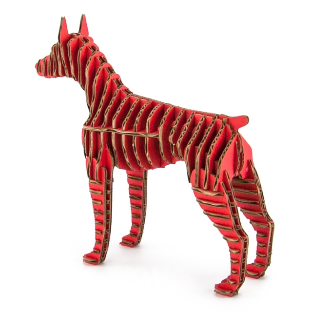 ドーベルマンは全78個の部品から構成されています。スマートな骨格と長い脚、そして水平な背中のラインが特徴です。胴体はダックス、芝犬と違い一体化されていますが、お腹の部分は中空になっています。これはFLATSの構造のなかでときどき現れるパターンです。お腹の部分を中空に保つために胴の連続部品の穴を背骨部分をくぐらせて差し込みます。組み立てとしては少し難易度が上がります。ダンボール製モデル5種と日田杉製ミニチュアモデル、全6種のラインナップです。ドーベルマンもライフサイズモデルを製作の予定です。