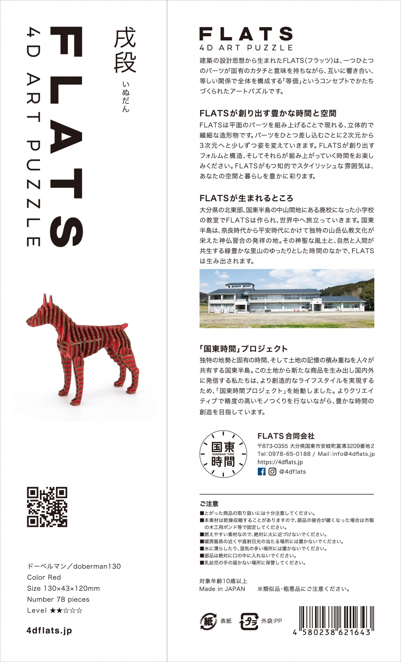毎年その年の干支の動物をモチーフとして製作されるFLATS干支シリーズ。FLATS「戌段(いぬだん)」はチワワ、ダックスフンド、しば犬に加え、新たにドーベルマンを製作しました。それぞれの犬種の特徴線を抽出し、今にも動き出しそうなイヌのたたずまいを丁寧に表現しています。はさみやカッター、接着剤を使わずに組み立てる事ができます。FLATSの精緻な造形による干支シリーズをどうぞお楽しみください。