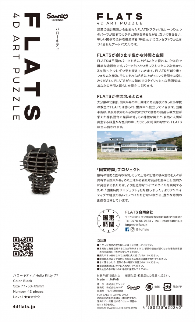 ダンボールを材料にしたハローキティの組み立てキットです。サンリオキャラクターの可愛らしさをFLATSの作法をもって丁寧に表現しました。FLATSの精緻な造形と個性溢れる、ハローキティのバリエーションをお楽しみ下さい。