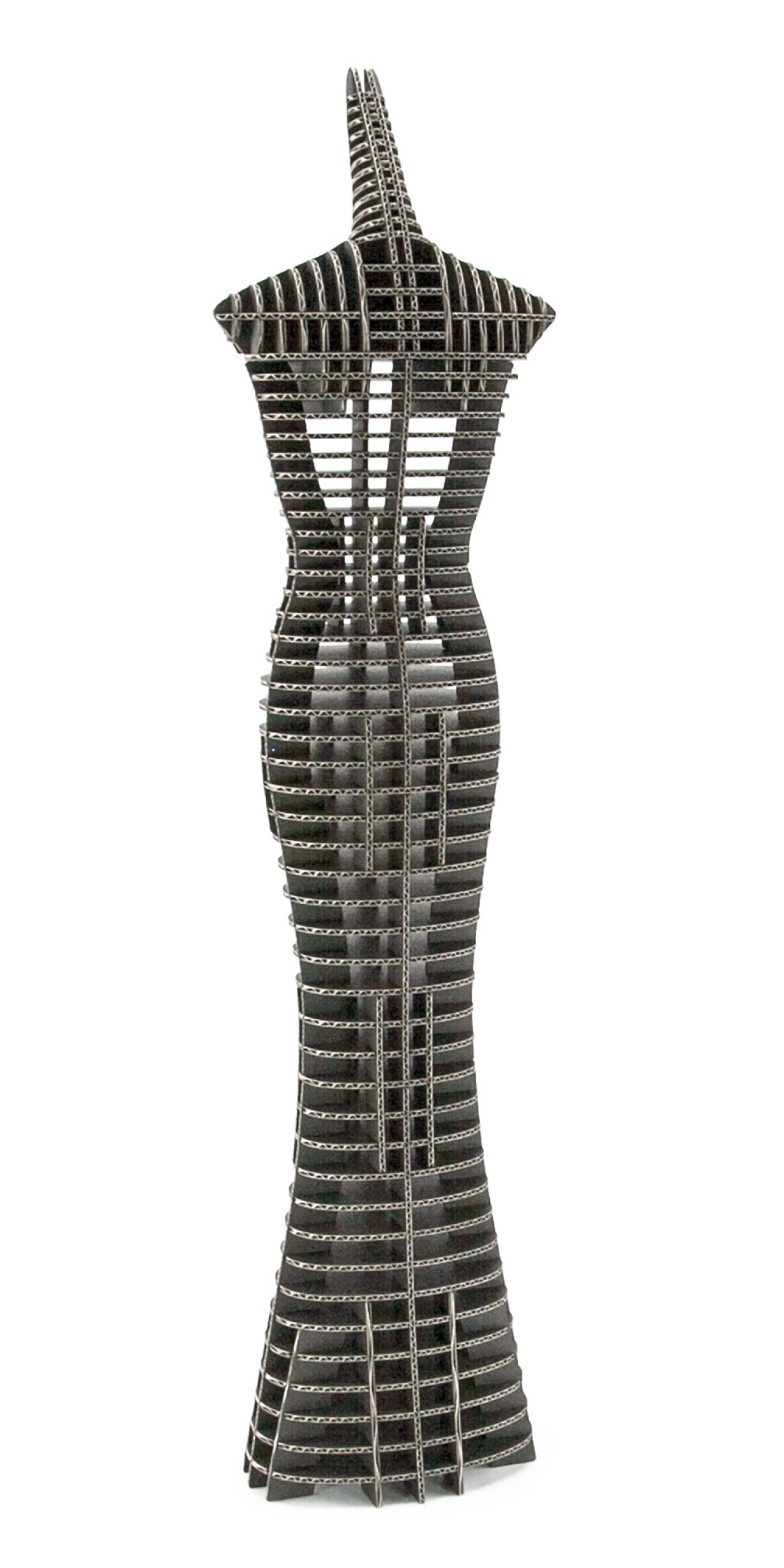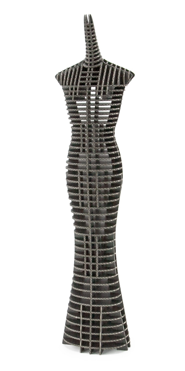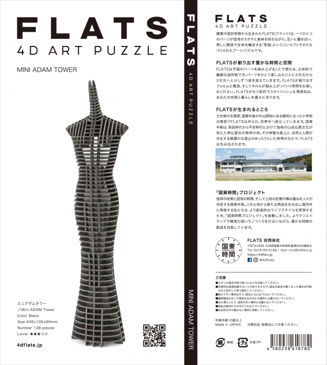 FLATS Mini EVE&ADAM Tower「 人段(ひとだん)」は段ボールシートを細密レーザーによって切断加工して製作されるペーパークラフトです。ADAM Tower の本体は128 個の段ボール部品で構成され、各パーツはA4 サイズのシートにレイアウトされています。組み立てに際しては接着剤やハサミ等をいっさい使用することなく、誰にでも簡単に組み立てを楽しんでいただけるように設計されています。