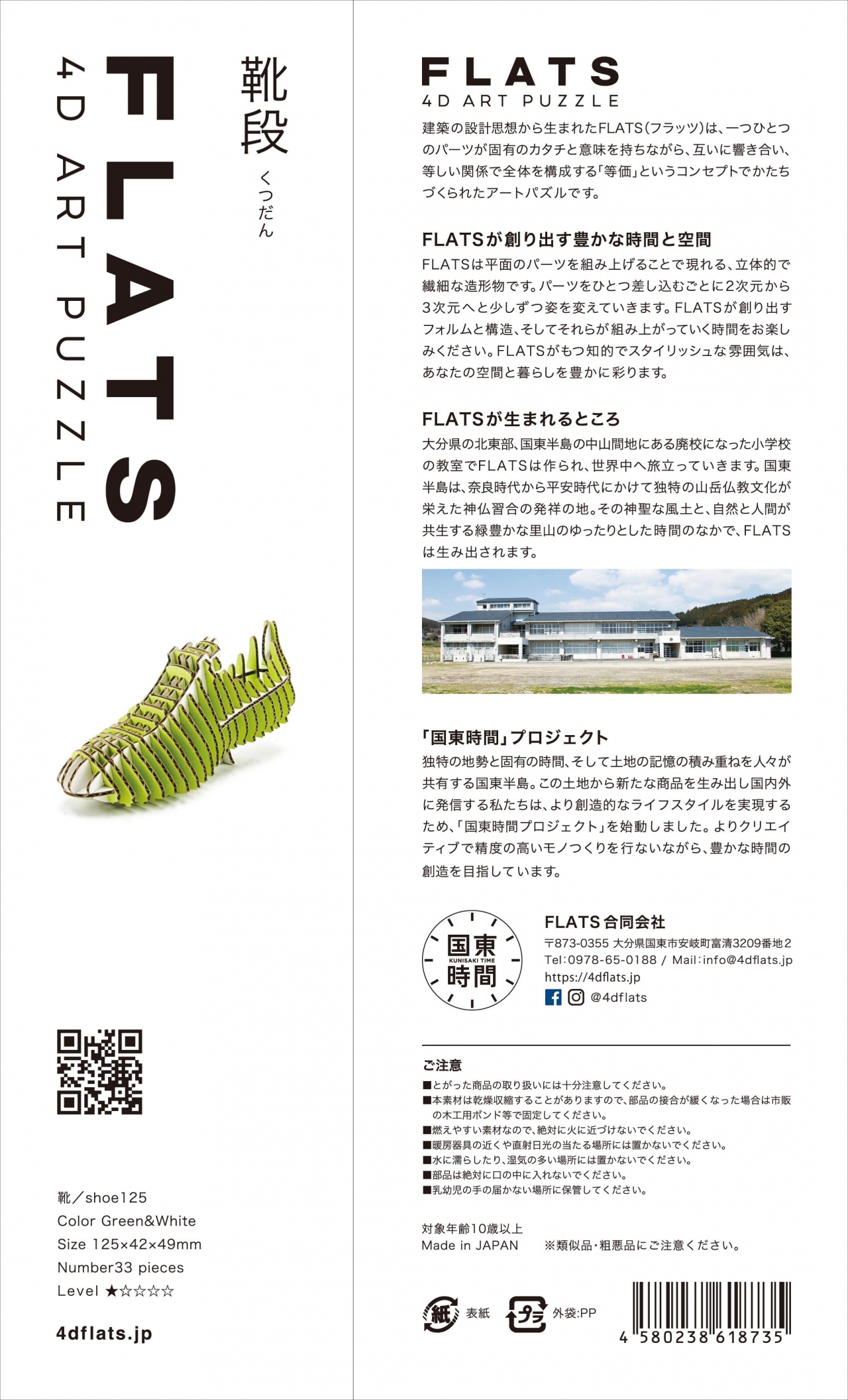 FLATS「靴段(くつだん)」はアシックスのランニングシューズをモチーフにした、ユニークな組み立てキットです。本体は33個の部品で構成されており、ハサミやノリを一切用いることなく誰にでも簡単に組み立てることができます。靴段は全4色をご用意しています。FLATSの精緻な造形とカラーバリエーションをお楽しみください。