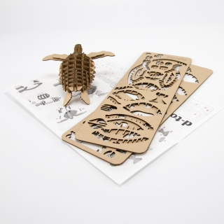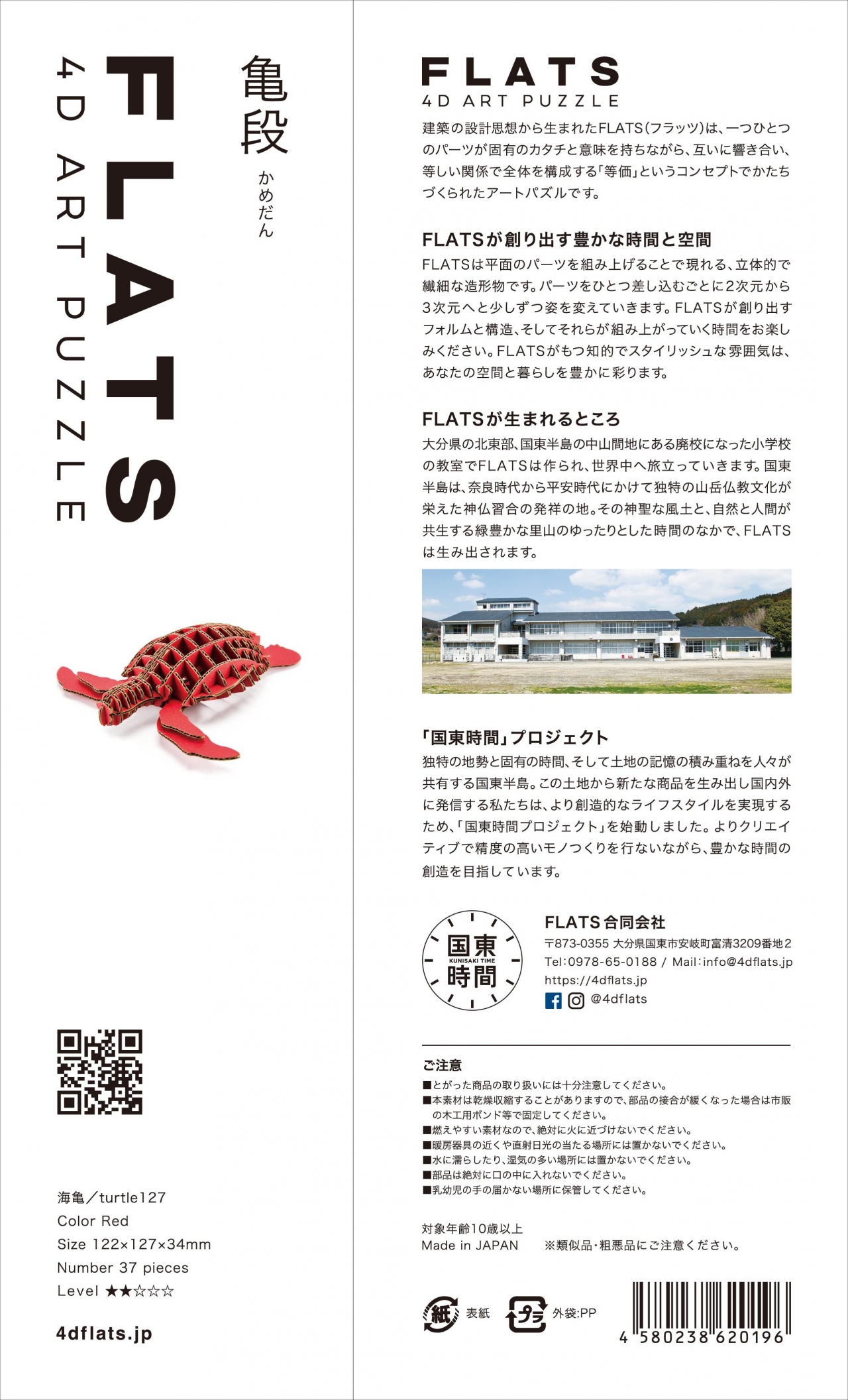 FLATS「亀段(かめだん)ウミガメ」は国東半島に生息するウミガメをモチーフにしたモデルです。海亀本体は37個の部品で構成されており、ハサミやノリを一切用いることなく誰にでも簡単に組み立てることができます。全5色をご用意しています。FLATSの精緻な造形とカラーバリエーションをお楽しみください。
