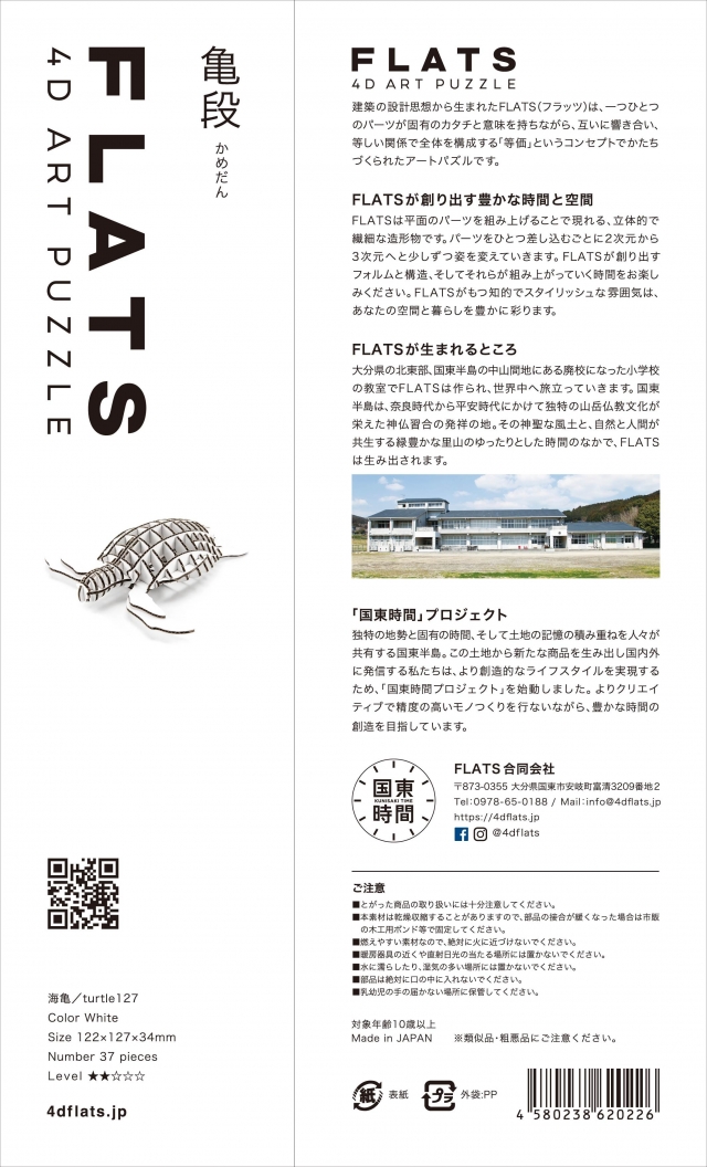 FLATS「亀段(かめだん)ウミガメ」は国東半島に生息するウミガメをモチーフにしたモデルです。海亀本体は37個の部品で構成されており、ハサミやノリを一切用いることなく誰にでも簡単に組み立てることができます。全5色をご用意しています。FLATSの精緻な造形とカラーバリエーションをお楽しみください。